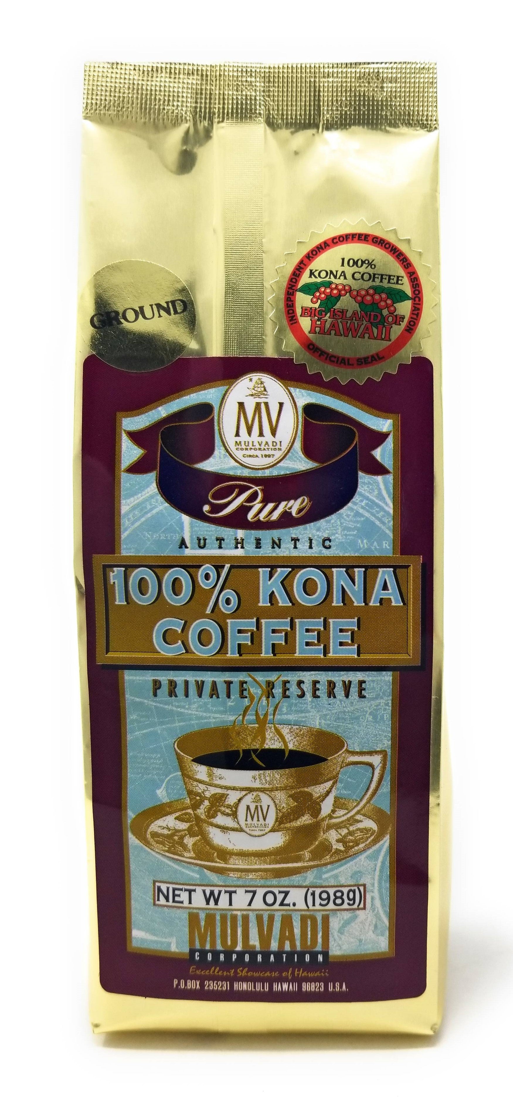 Experience the smooth, rich taste of Mulvadi 100% Kona Coffee Private Reserve. Grown in the fertile volcanic soil of Hawaii’s Big Island, this premium ground coffee offers a naturally sweet, mellow flavor with a smooth finish. Packed in a resealable 7-ounce bag, Mulvadi Private Reserve delivers freshness and convenience with every brew. Whether you enjoy it hot or iced, this Kona coffee brings the authentic taste of Hawaii straight to your cup.