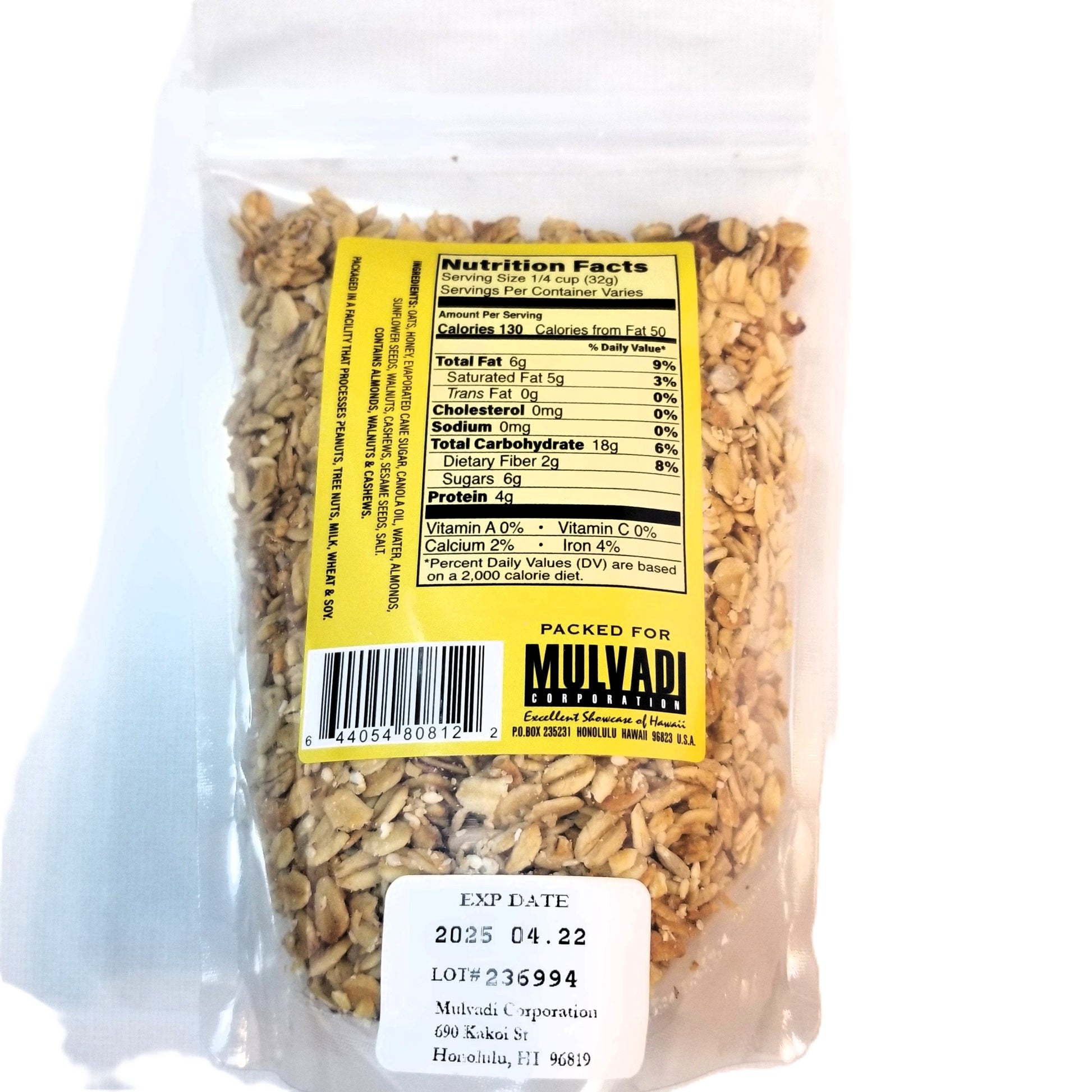 ハワイ製 マルヴァディは、カリカリのオート麦、ローストアーモンド、そして蜂蜜の自然な甘さを組み合わせた、ヘルシーで美味しいグラノーラです。朝食のトッピング、おやつ、あるいは罪悪感のないおやつとしても最適なこのグラノーラは、島の味をあなたの食卓にお届けします。