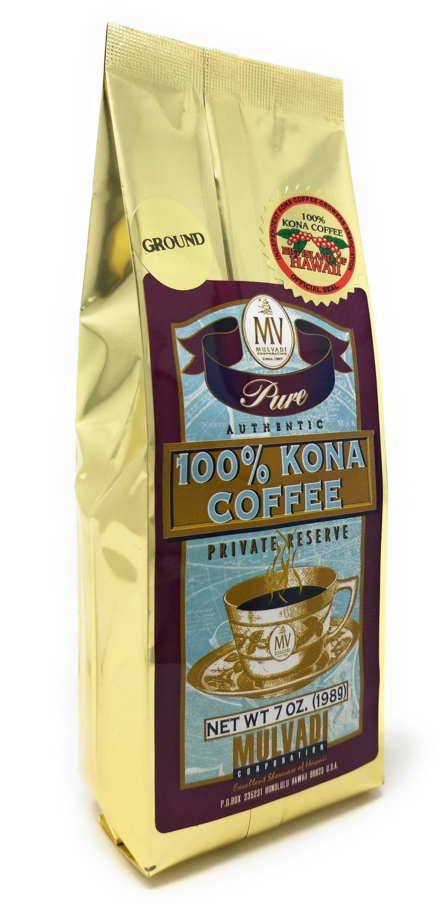 マルヴァディ 100%コナコーヒー プライベートリザーブ 挽き 7オンス 再封可能バッグ – プレミアムハワイアンコーヒー / 送料無料
